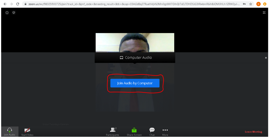 Once the host (lecturer) starts the meeting, you should be directed to the screen below. Click on the Join Audio by Computer button so that you can hear all the sounds in the session.