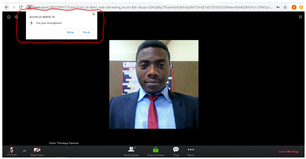 Next, enable the Zoom application to use your microphone by clicking on Allow, so that you can be able to speak to the host (lecturer) or other participants (students) during the session.
