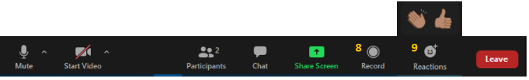 9 – The Reactions button – This can be used to show your reactions to the host (lecturer). Typical actions include; wave and thumbs up. May be found under the “more” control.