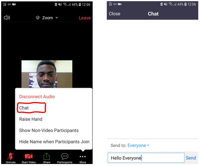 5 – The More button – Click to show more functions that you can perform in the Zoom session. An important function is the Chat group. The chat group allows you to Send a message to Everyone, the lecturer only or to a specific student.
