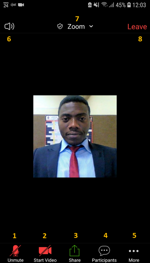 4 – The Participants button – This enables you to view all the people present in the Zoom session. It also contains icons that allow you to notify the lecturer e.g. yes, no, go slower, go faster, away, clap, raise hand (this notifies the lecturer that your hand is raised which may signify that you want to ask or answer a question).